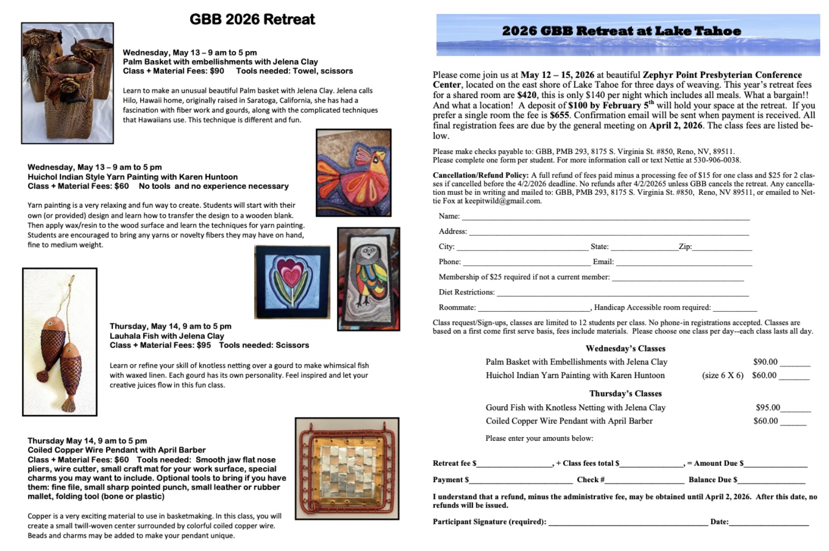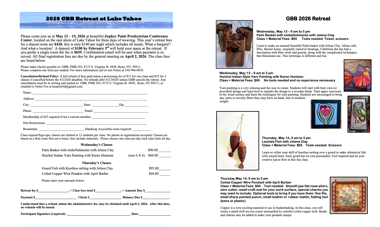 This year's Great Basin Basketmakers Retreat will be held from May 12-15, 2026 at Zephyr Point Presbyterian Conference Center located on the shores of Lake Tahoe. Jelena Clay from Hilo, Hawaii, will be offering two workshops - Palm Basket with embellishments and Lauhala Fish. Karen Huntoon is offering a Huichol Indian Style Yarn Painting workshop. April Barber is teaching a Coiled Copper Wire Pendant workshop.